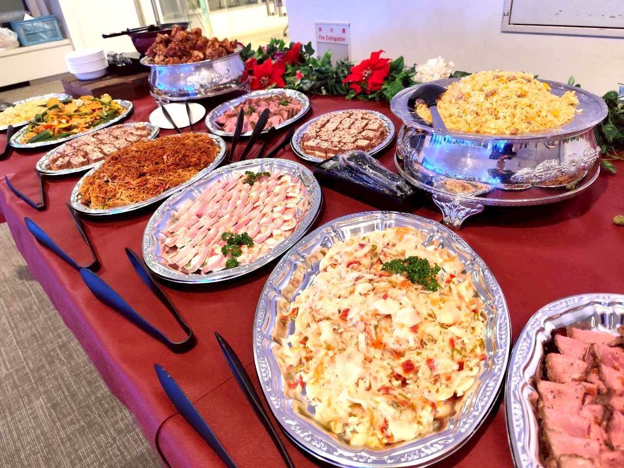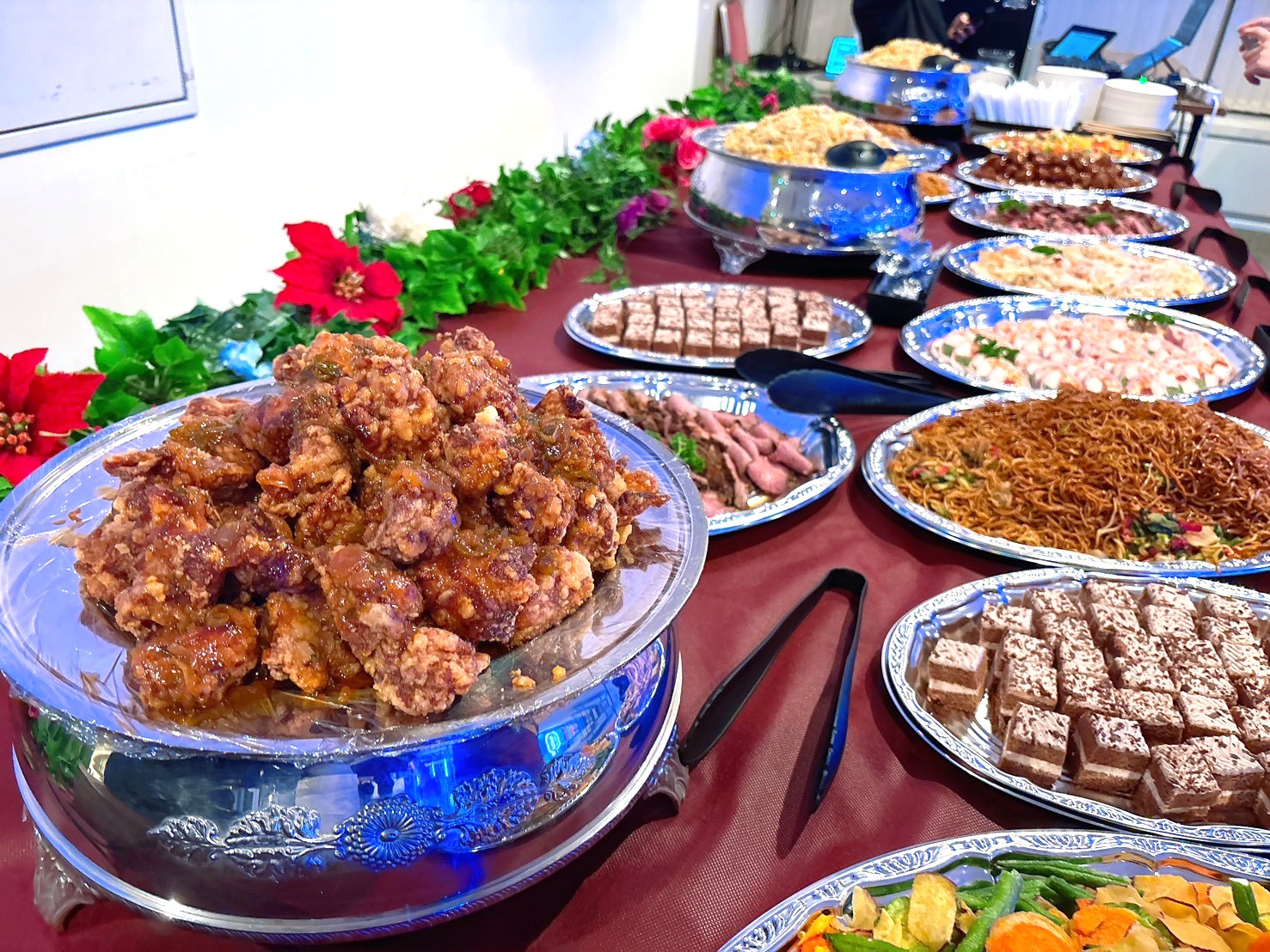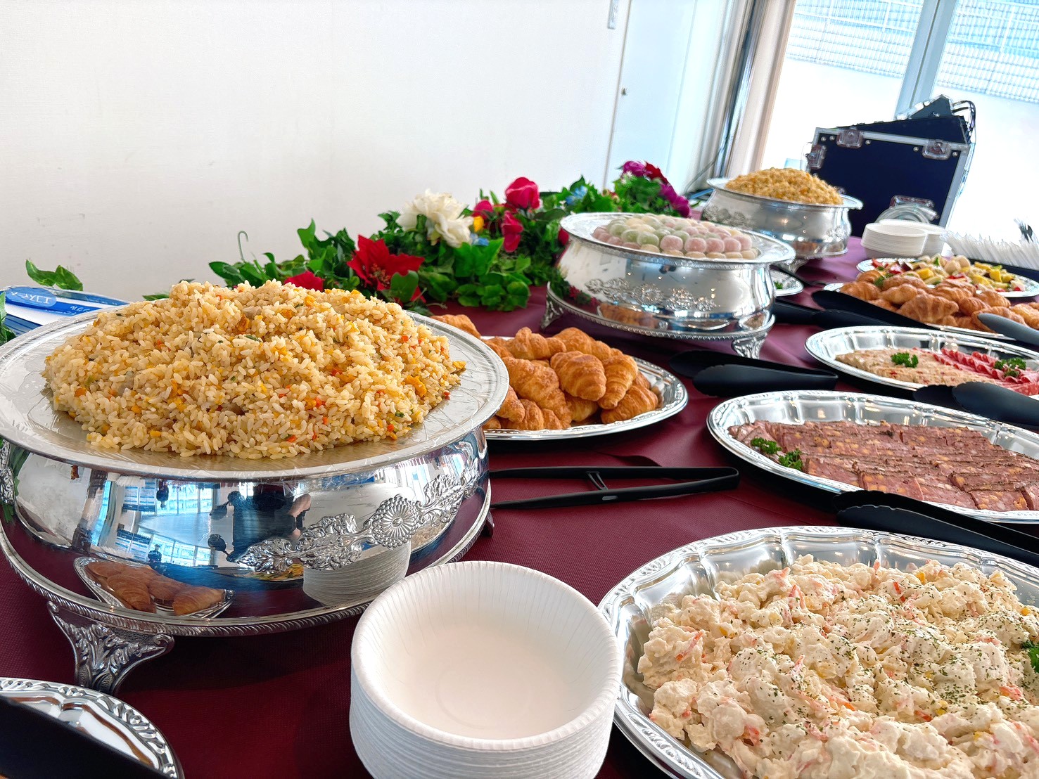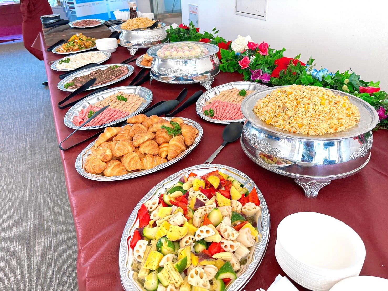 気軽に楽しめる内容でありながら、ボリュームと彩りのバランスを大切に構成いたしました。旬の食材を取り入れた前菜や、幅広い世代の方にお楽しみいただけるメイン料理を中心に、見た目にも華やかなビュッフェスタイルでご用意。明るい時間帯の開催ということもあり、ナチュラルカラーを基調にしたテーブルコーディネートで、爽やかさと温かみのある空間を演出いたしました。お料理は開始直前までカバーをかけ、衛生面にも十分配慮しております。