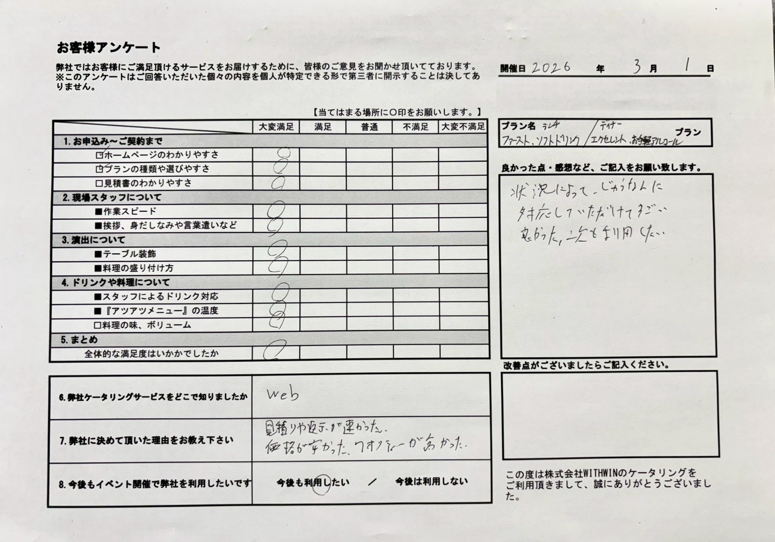 この度は大切な会にケータリングジャパンをお選びいただき、誠にありがとうございました。