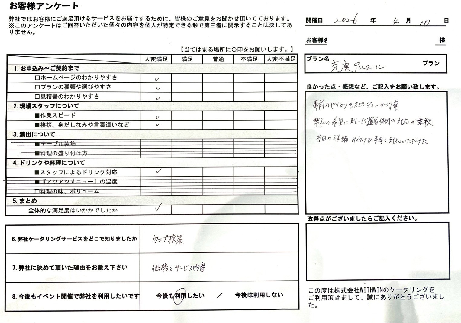 本日2026年4月10日にご利用のお客様 合同会社某様のケータリングの様子と直筆アンケートをご紹介いたします。