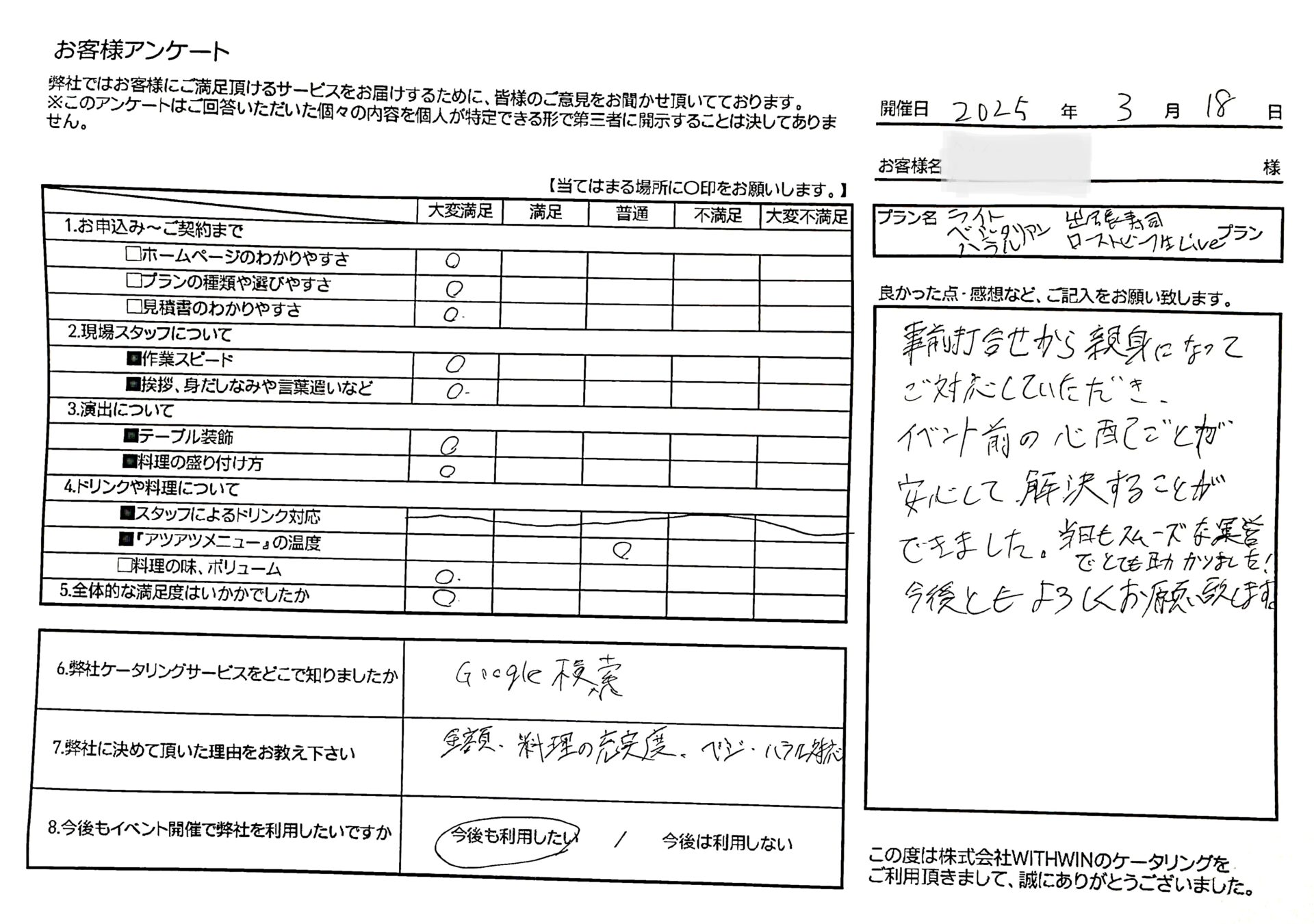 学校法人S大学様、この度はケータリングジャパンをご利用いただき、誠にありがとうございました。大切な企業イベントのお手伝いができましたこと、スタッフ一同心より感謝申し上げます。