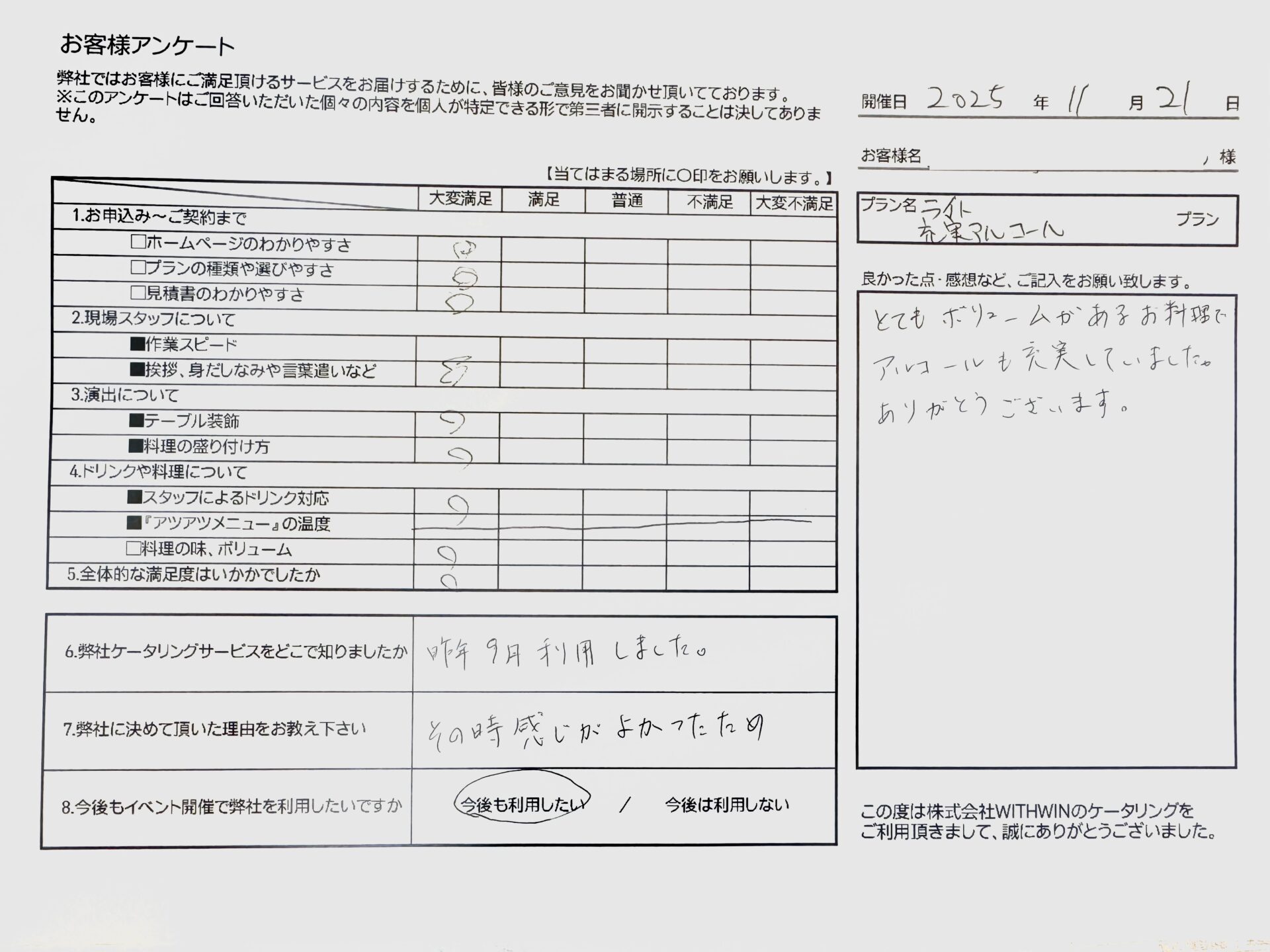 某大学院の皆様、この度は大切な親睦のひとときを私共にお任せいただき、誠にありがとうございました。