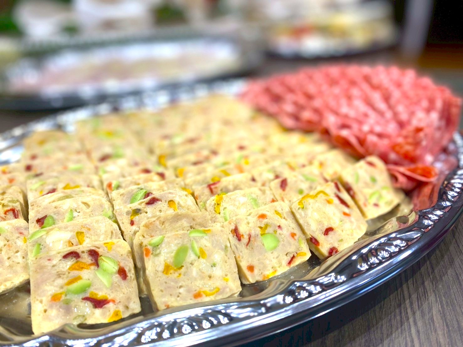 彩り鮮やかな冷製料理: 断面が美しいテリーヌやサラミの盛り合わせなど、視覚的にも楽しめるお料理を配置。