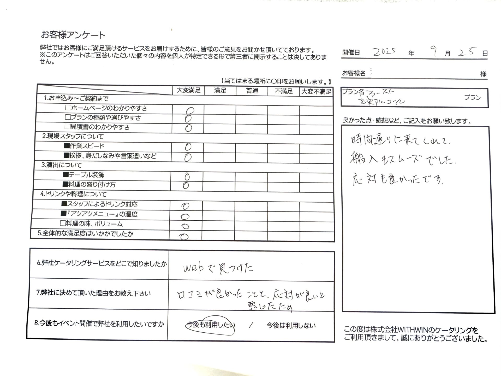 アンケートの最後には「今後も利用したい」という力強いお言葉をいただき、スタッフ一同、感激しております。