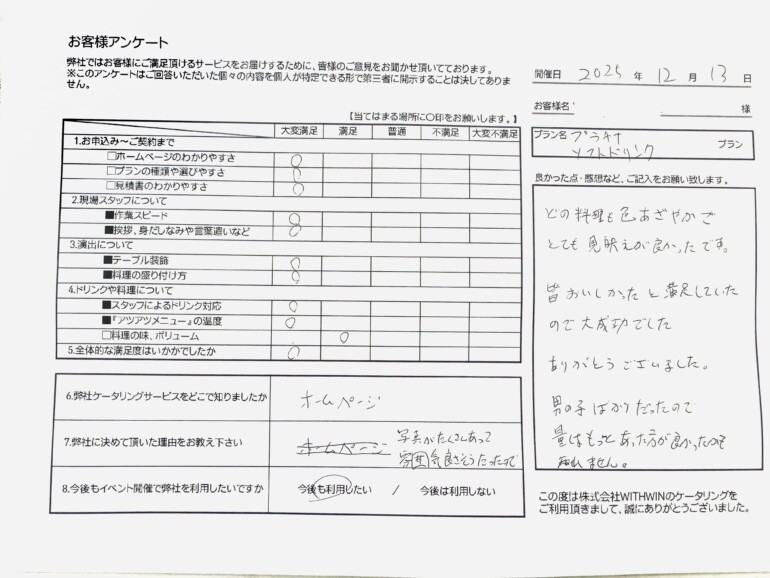 株式会社某様、この度は大切な節目にケータリングジャパンをご利用いただき、誠にありがとうございました。