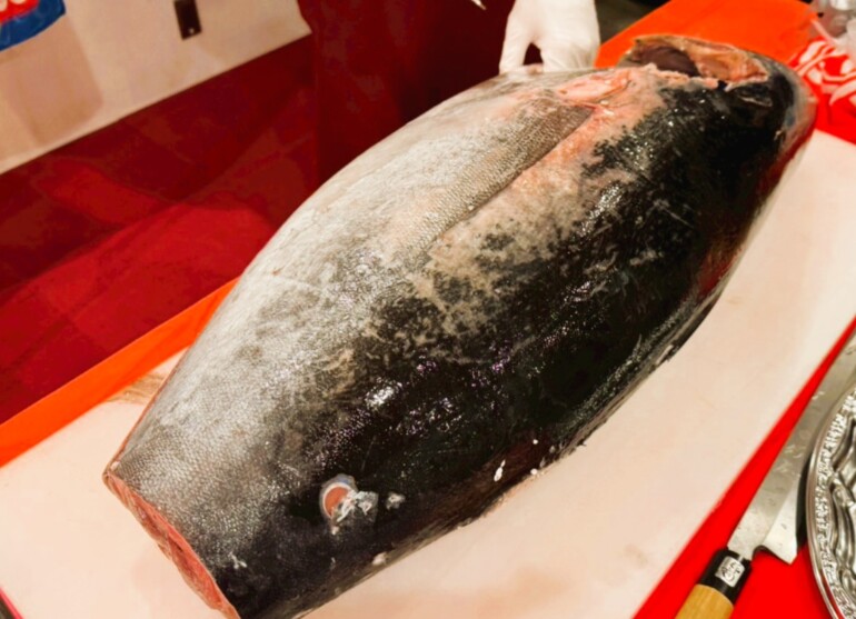 会場に大きなマグロが運び込まれると、自然と人だかりができ、開始前から注目が集まっていました。