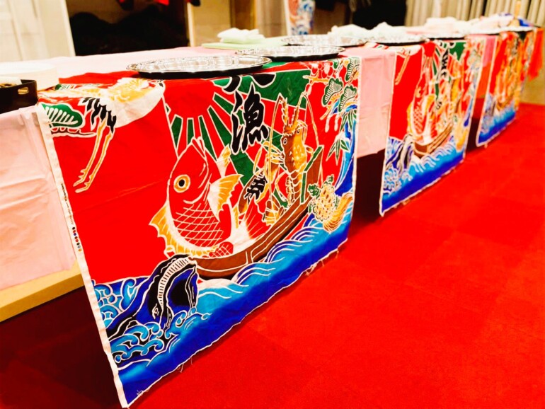 テーブル前面に鮮やかな大漁旗をあしらうことで、マグロ解体ショーへの期待感を高め、非日常感のある空間づくりを行いました。