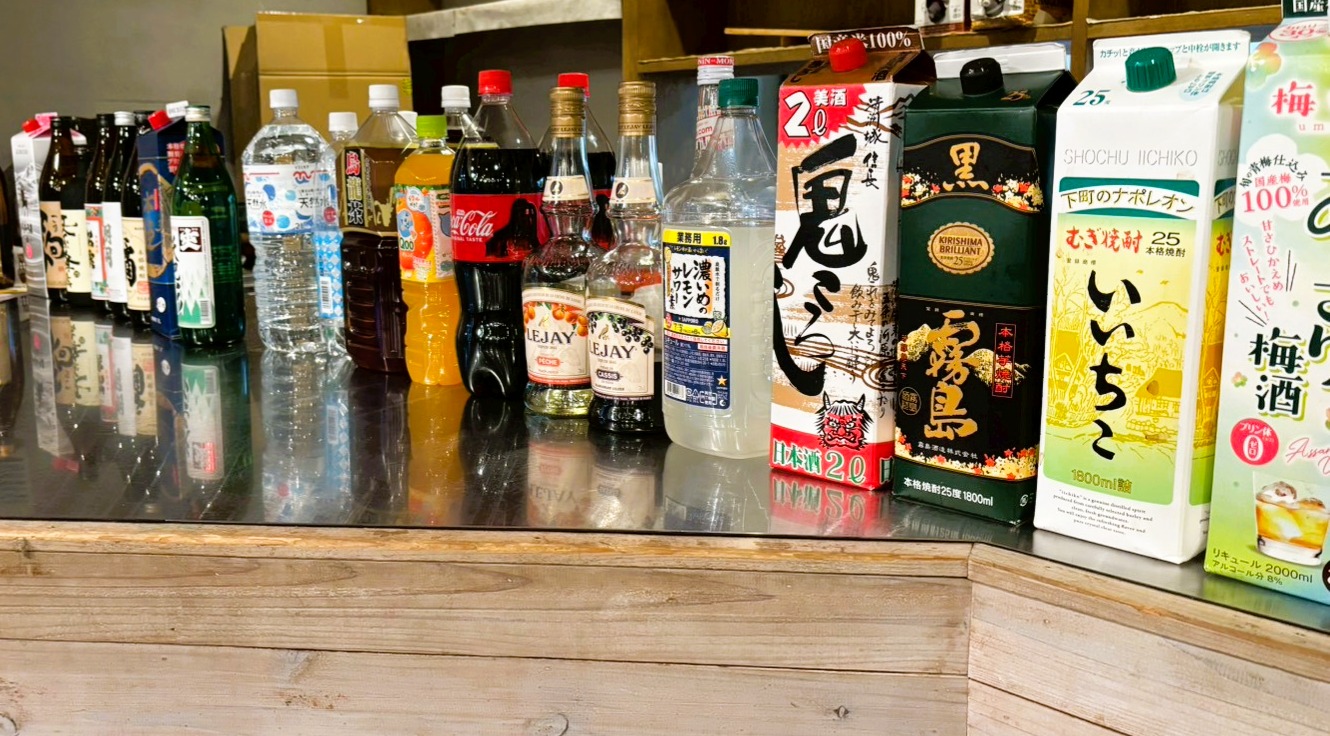 ビールやソフトドリンクはもちろんのこと、本格焼酎「黒霧島」「いいちこ」、日本酒「鬼ころし」、カシスやピーチのリキュール、さらには梅酒まで、バーカウンターさながらの豊富なラインナップをご用意。