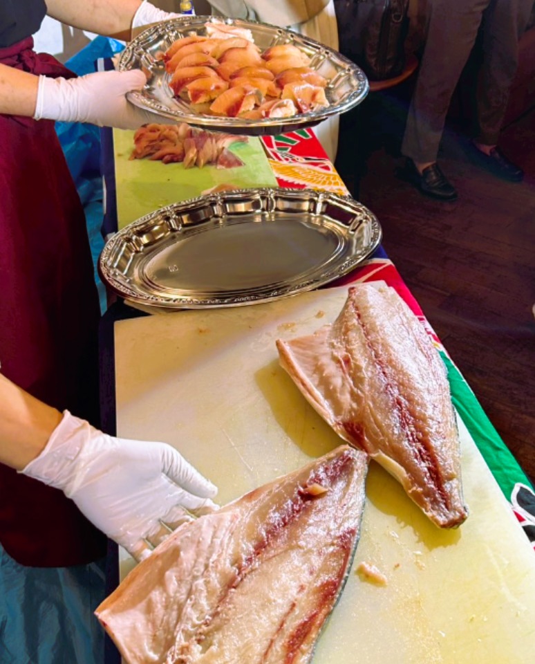 パーティーの目玉として登場したのは、丸々と太った立派なブリ。会場に運び込まれた瞬間から、ゲストの皆様の期待に満ちた熱い視線が集まりました。