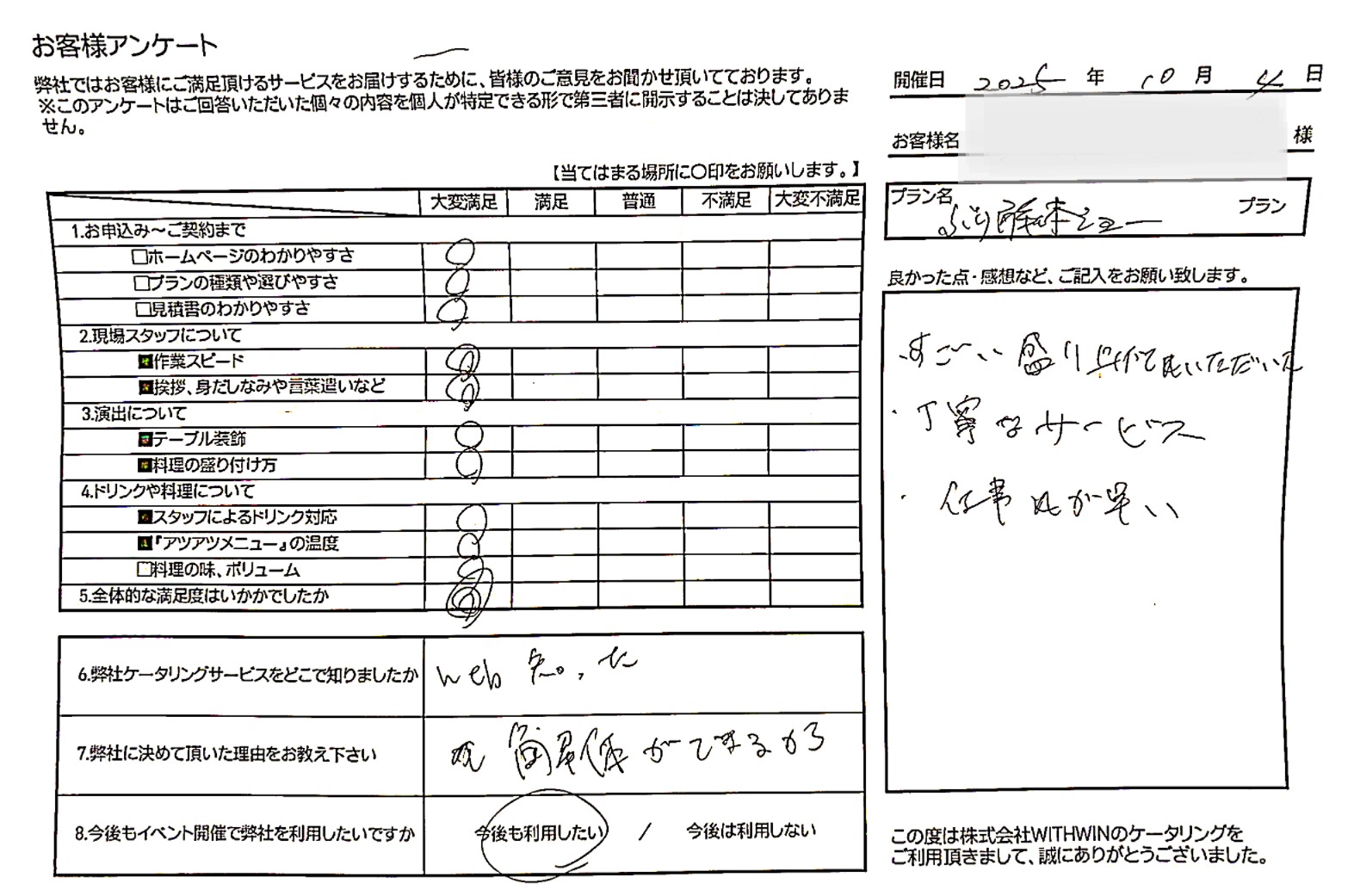 この度は、ケータリングジャパンをご利用いただき、誠にありがとうございました。
