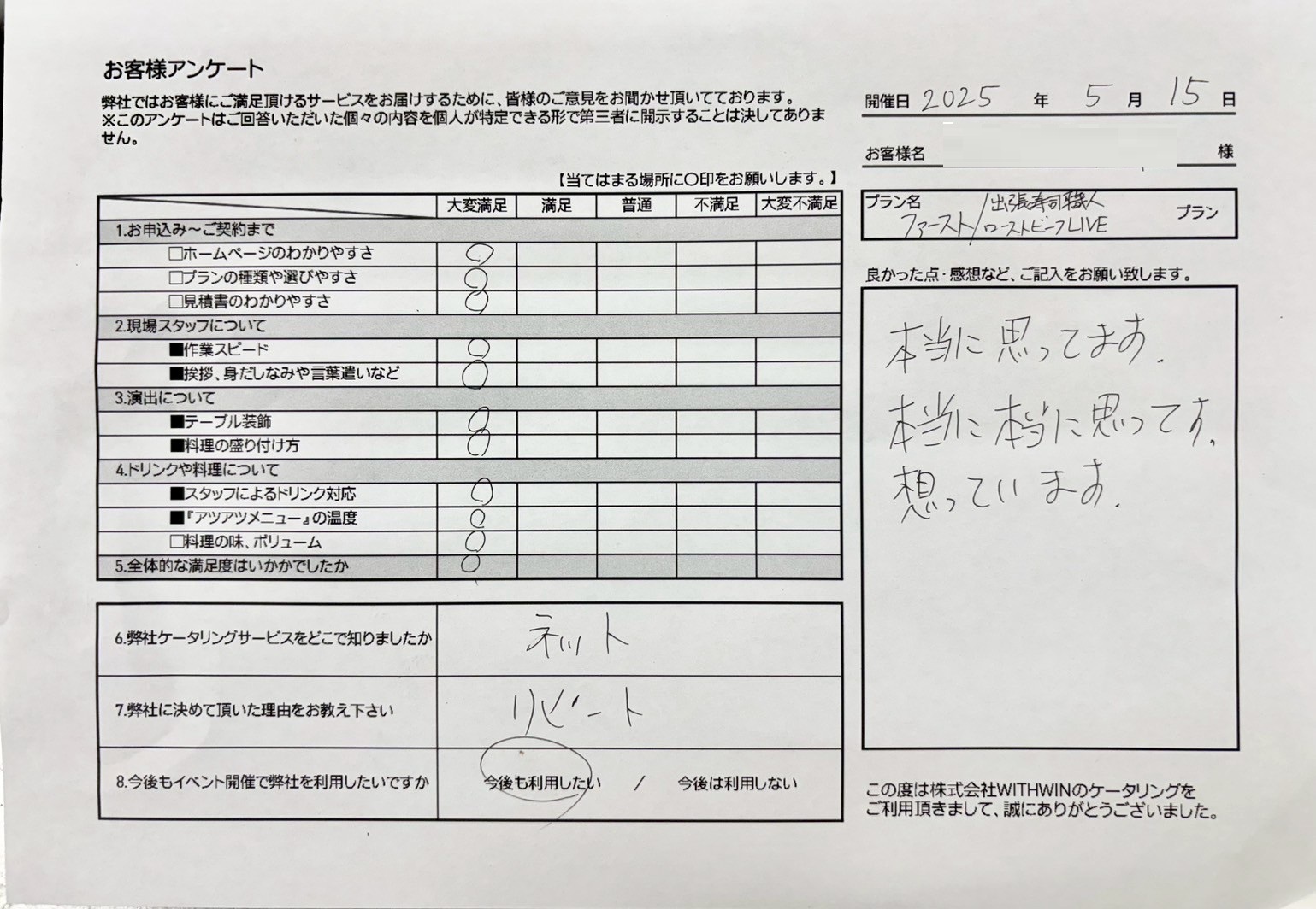 今回のご利用にあたり、お客様が弊社を選んでくださった理由は「リピート」。