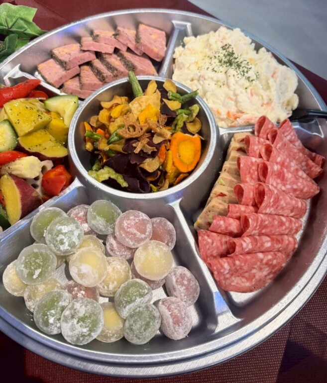 今回はお食事をテーブルごとに置くためオードブル容器にてご提供しました。