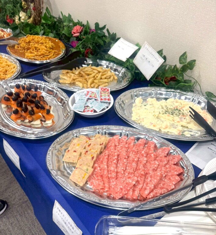 各料理は立食でも取りやすい配置とし、