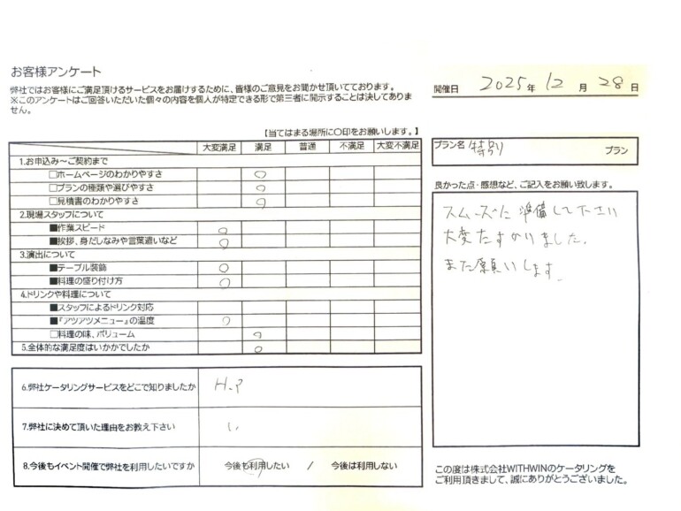 この度は、ケータリングジャパンをご利用いただき、誠にありがとうございました。