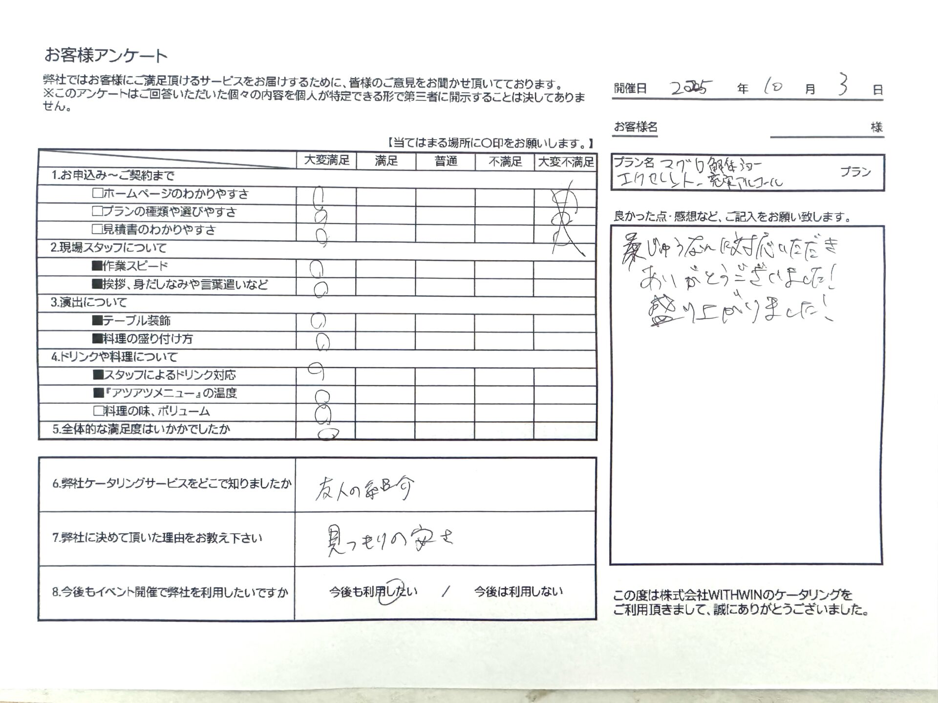 東京でケータリングのケータリングジャパンです。本日2025年10月3日にご利用いただきました株式会社某様のケータリングの様子と、直筆アンケートをご紹介いたします。