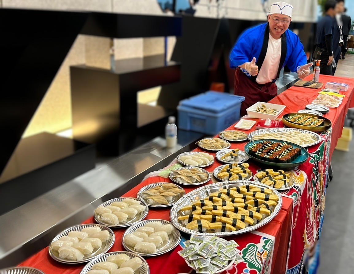 赤いクロスの上に美しく盛り付けられた料理は、まるでお祭りのような華やかさ。職人さんの明るい笑顔とポーズが、その場の楽しさをさらに引き立て、自然と会話や笑い声が生まれていきます。