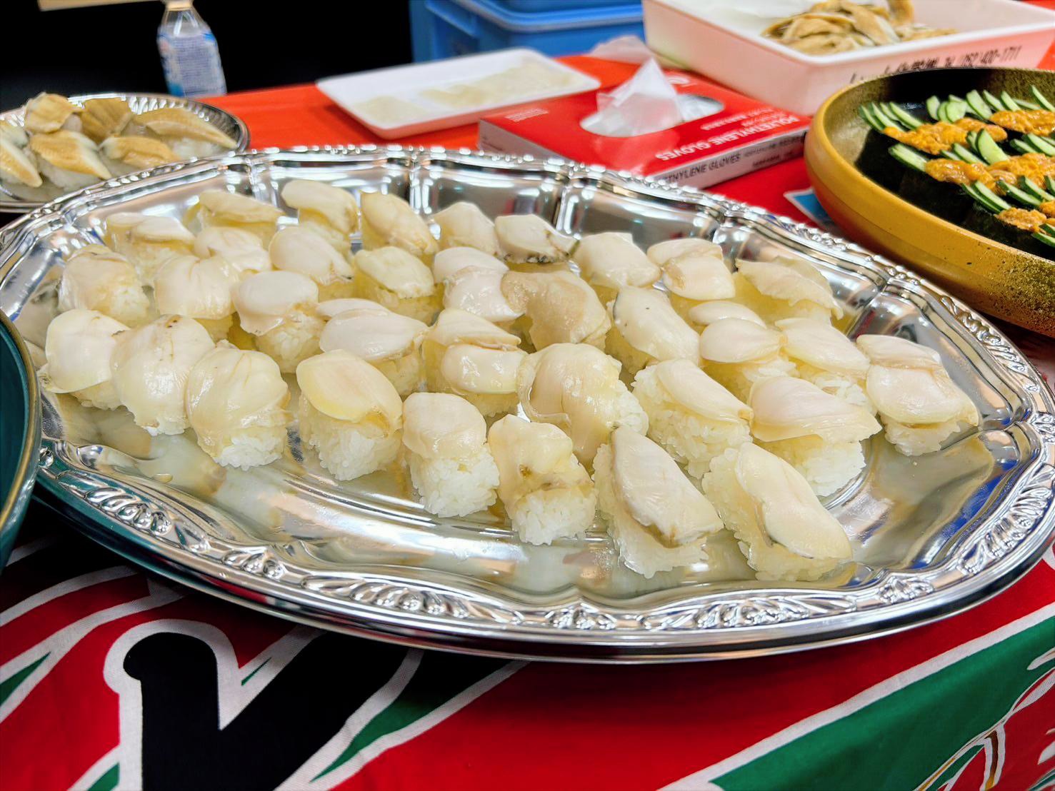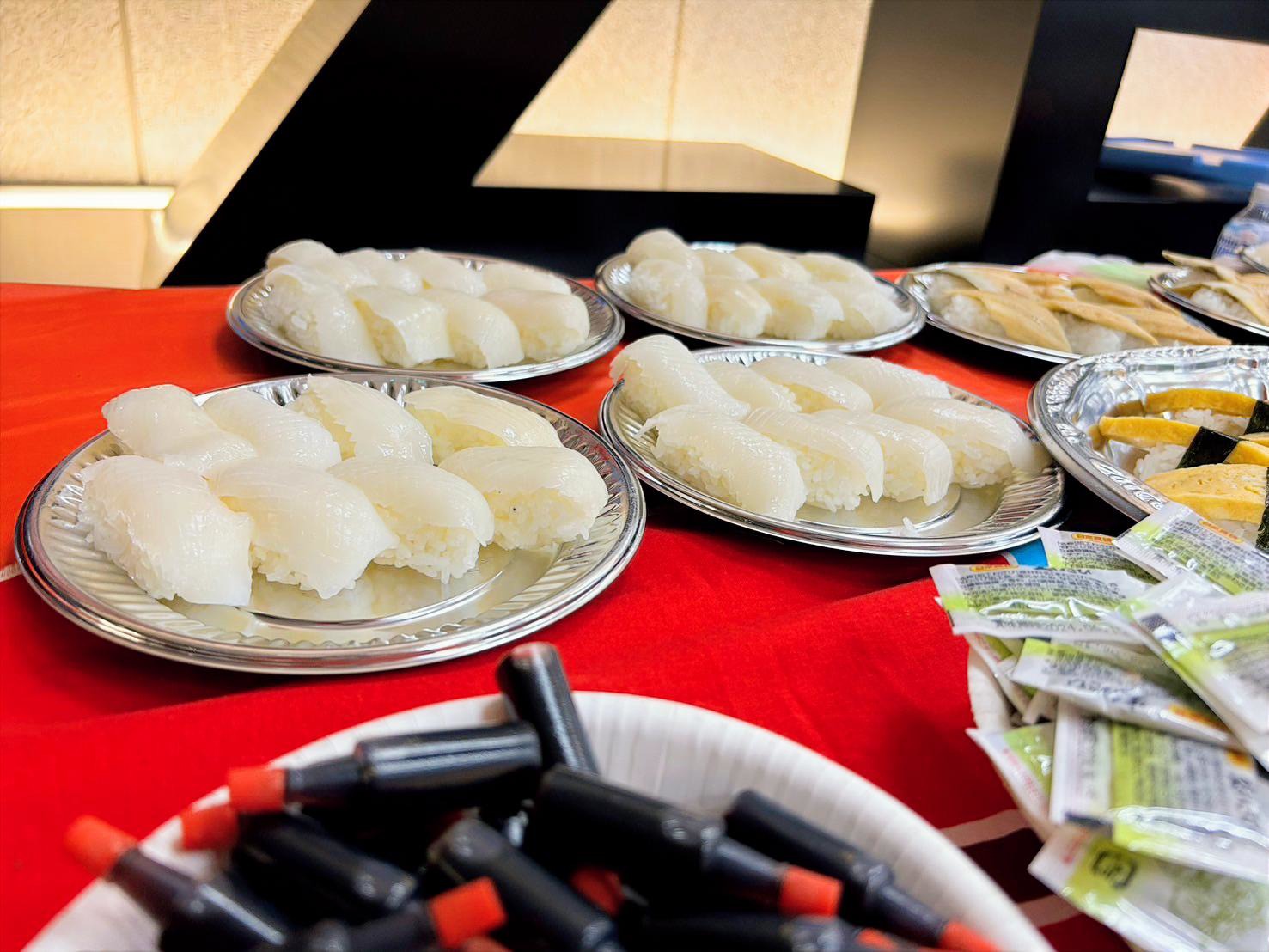 ずらりと並んだ寿司の数々——とりわけ上品な輝きを放つイカの握りが、ゲストの期待を一気に高めます。