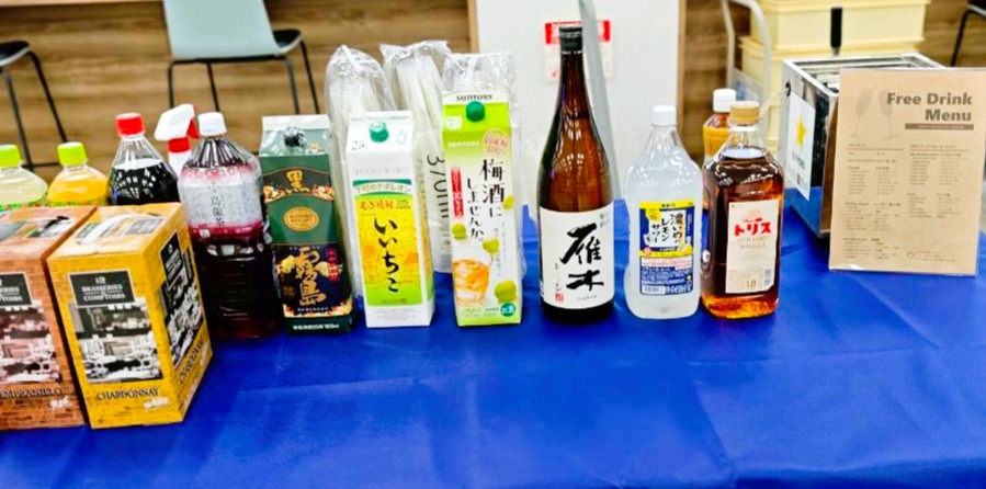 乾杯の生ビールを提供するため、ビールサーバーを設置。そして、ワイン(シャルドネ、テンプラニーリョ)、烏龍茶、コーラ、濃いめのレモンサワーの素、そしてこだわりの日本酒(「獺祭」純米大吟醸45)、焼酎(「いいちこ」)、そして「トリス」ウイスキーなど、実に多様なドリンクをずらりと並べました。これだけの豊富なラインナップなら、どんなお好みの参加者様でも、必ずお気に入りの一杯が見つかるはずです。準備が整ったドリンクカウンターは、まさに「大人の遊び場」。お好みに合わせてお楽しみいただける、ワクワクする空間に仕上がりました。