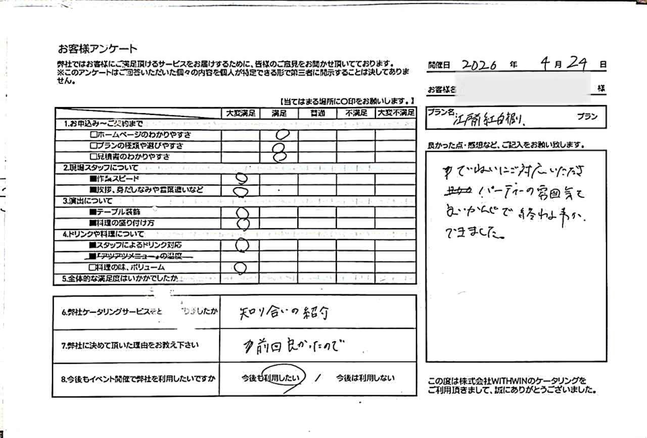 本日は、2026年4月24日にご利用いただきました、株式会社C様のケータリングのご様子と、大変嬉しいことに頂戴いたしました直筆アンケートをご紹介させていただきます。