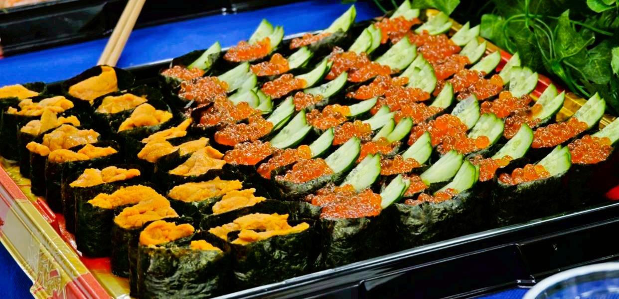 さらに、別のトレーには、濃厚なウニの軍艦と、キラキラと輝くイクラの軍艦が、シャキシャキのきゅうりとともに彩りを添えていました。その鮮やかさは、まるで芸術作品のよう。多くのお客様が足を止め、写真を撮影されている姿が印象的でした。