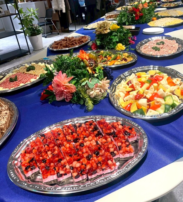 彩り豊かな蒸し野菜や、一口サイズのデザート、ホットミールまで、テーブルを隙間なく埋め尽くす豪華なラインナップです。
