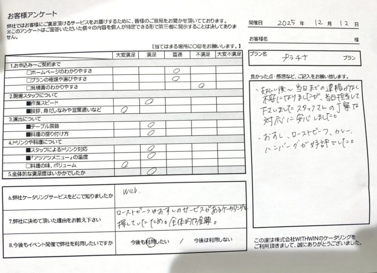 2025年12月12日(金)に、株式会社O様のパーティーをお手伝いさせていただきました。