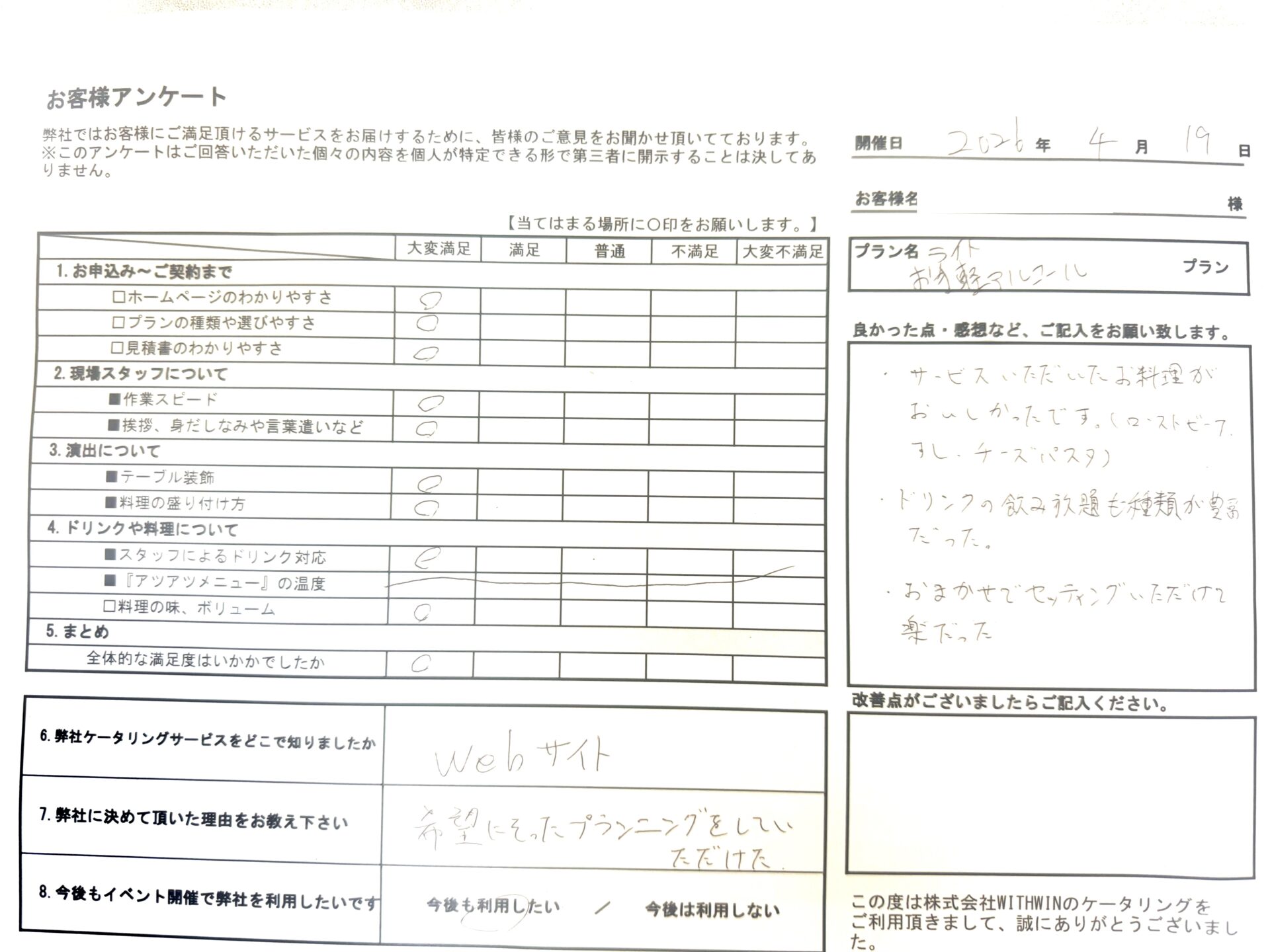 実施後のアンケートでは、全ての項目で「大変満足」という最高の評価をいただきました!