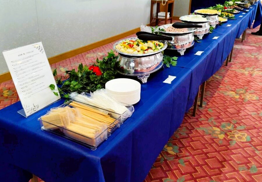 今回は50名様でのご利用ということもあり、華やかさはもちろんのこと、「お食事の満足感」と「会場の回遊性」を両立させた特別なビュッフェスタイルをご提案いたしました。