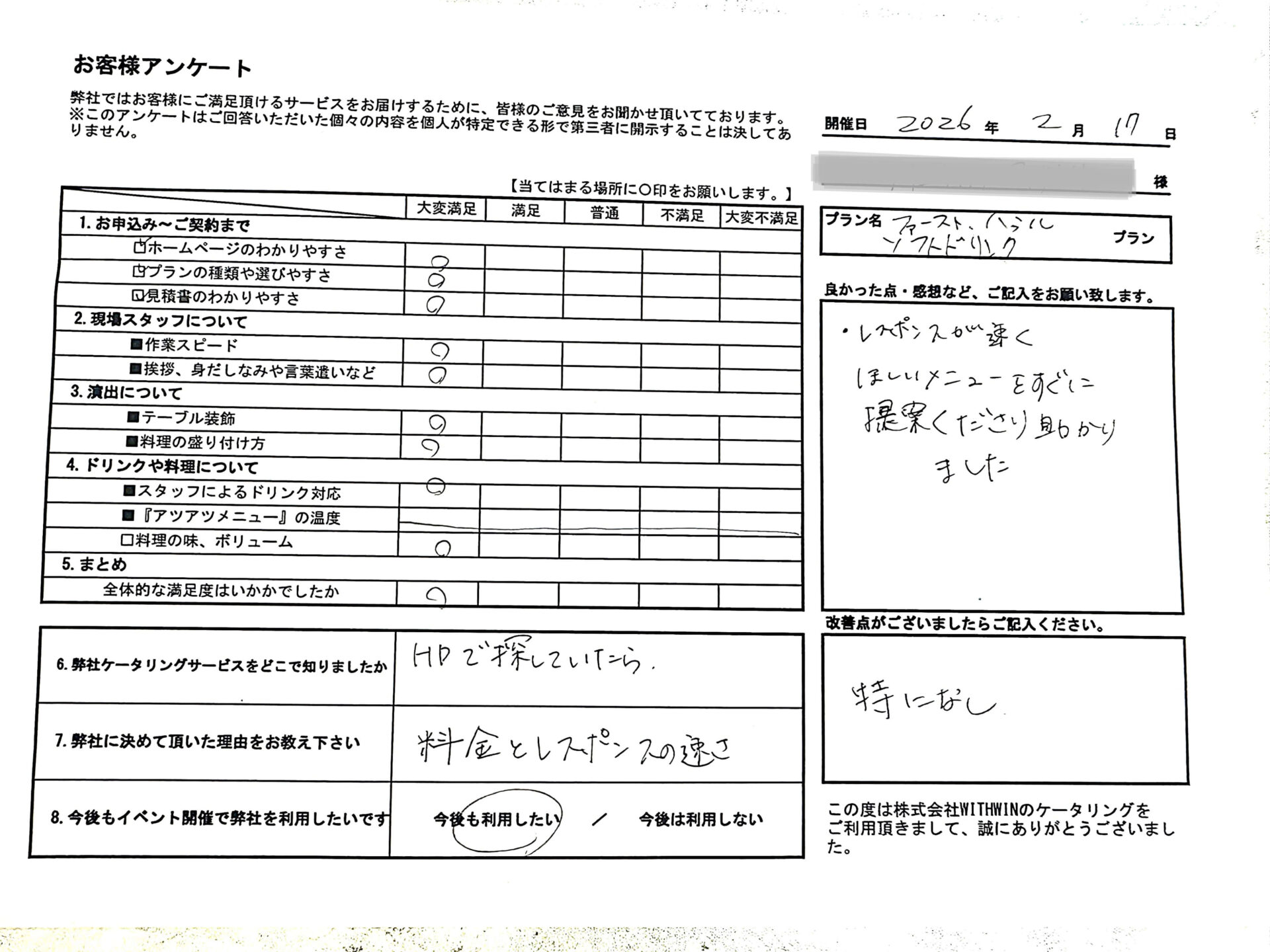 レスポンスが速く、ほしいメニューをすぐに提案くださり助かりました