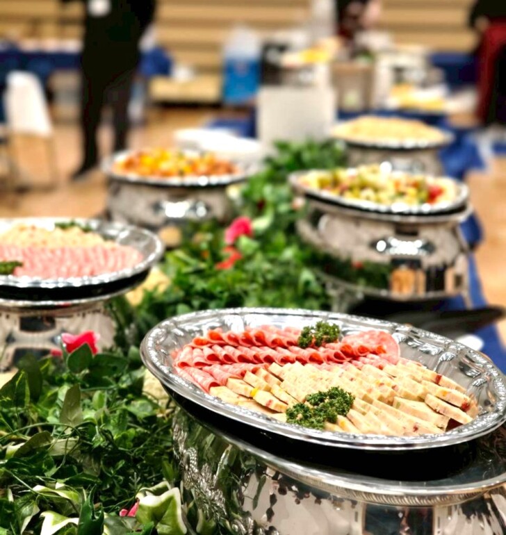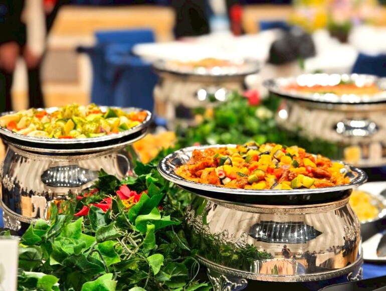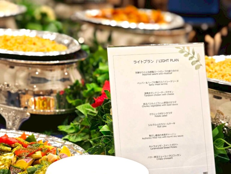 まるで青い海の上に、美しい料理が浮かんでいるかのようなコントラスト。シルバーのチェーフィングディッシュが上品に輝き、色とりどりのメニューがずらりと並びます。