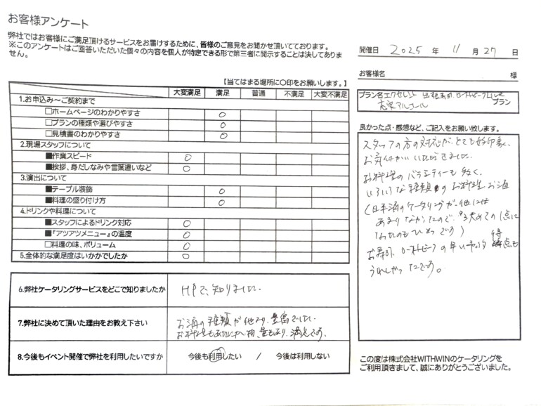 この度は、ケータリングジャパンをご利用いただき、誠にありがとうございました。