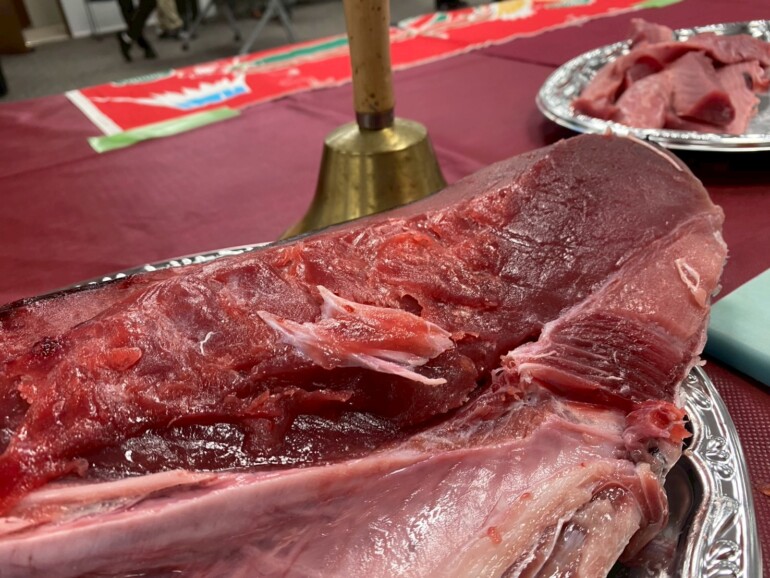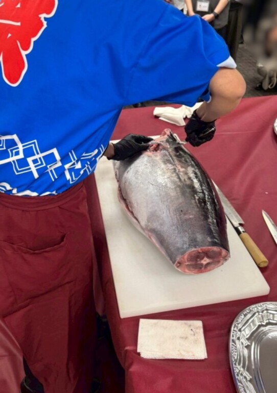 当日は、職人が包丁を手に、目の前でマグロを解体