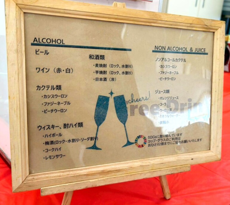 他にもカクテル・ワイン(赤・白)・ウイスキー・酎ハイ類からノンアルコール・ジュースまで