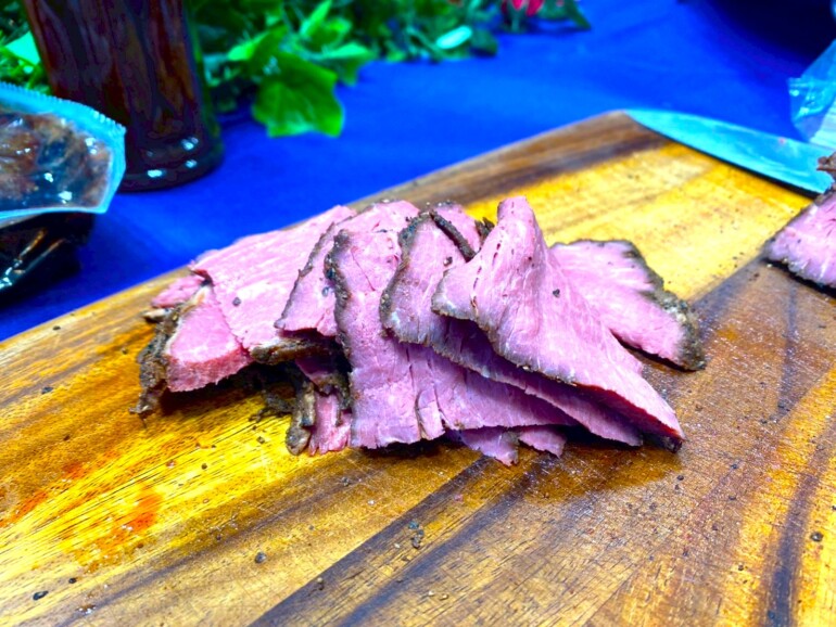 です。 低温でじっくりと時間をかけて火を通した塊肉は、表面の香ばしい焼き色とは対照的に、断面は鮮やかなローズピンク。