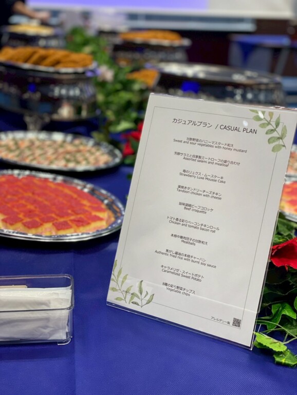 95名様という規模でも、配置や導線を工夫することで、どの位置からもお料理が取りやすく、かつ視覚的にも華やかな空間を演出いたしました。